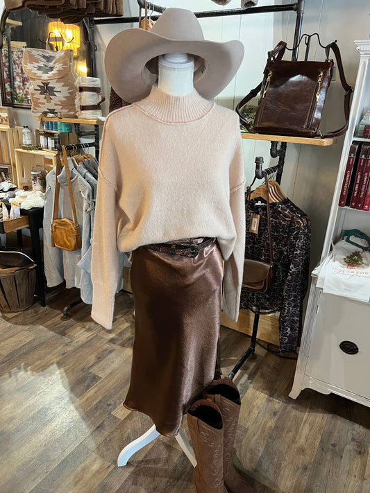 HIGH WAISTED MIDI LENGTH SATIN SKIRT