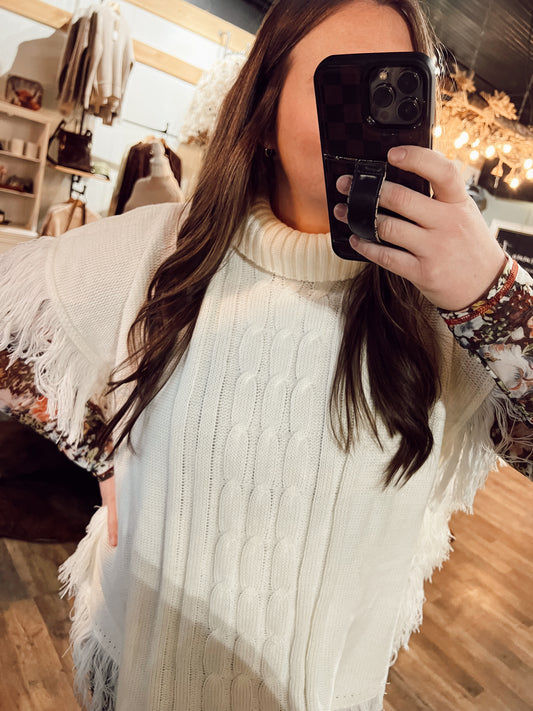 CABLE KNIT TURTLENECK FRINGE PONCHO