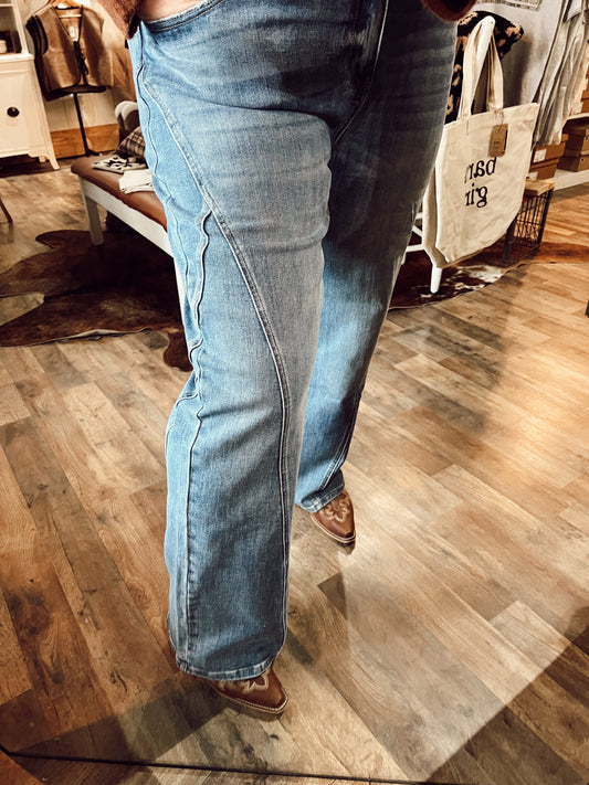TWO TONE SIDE PANEL BARREL CROP JEAN