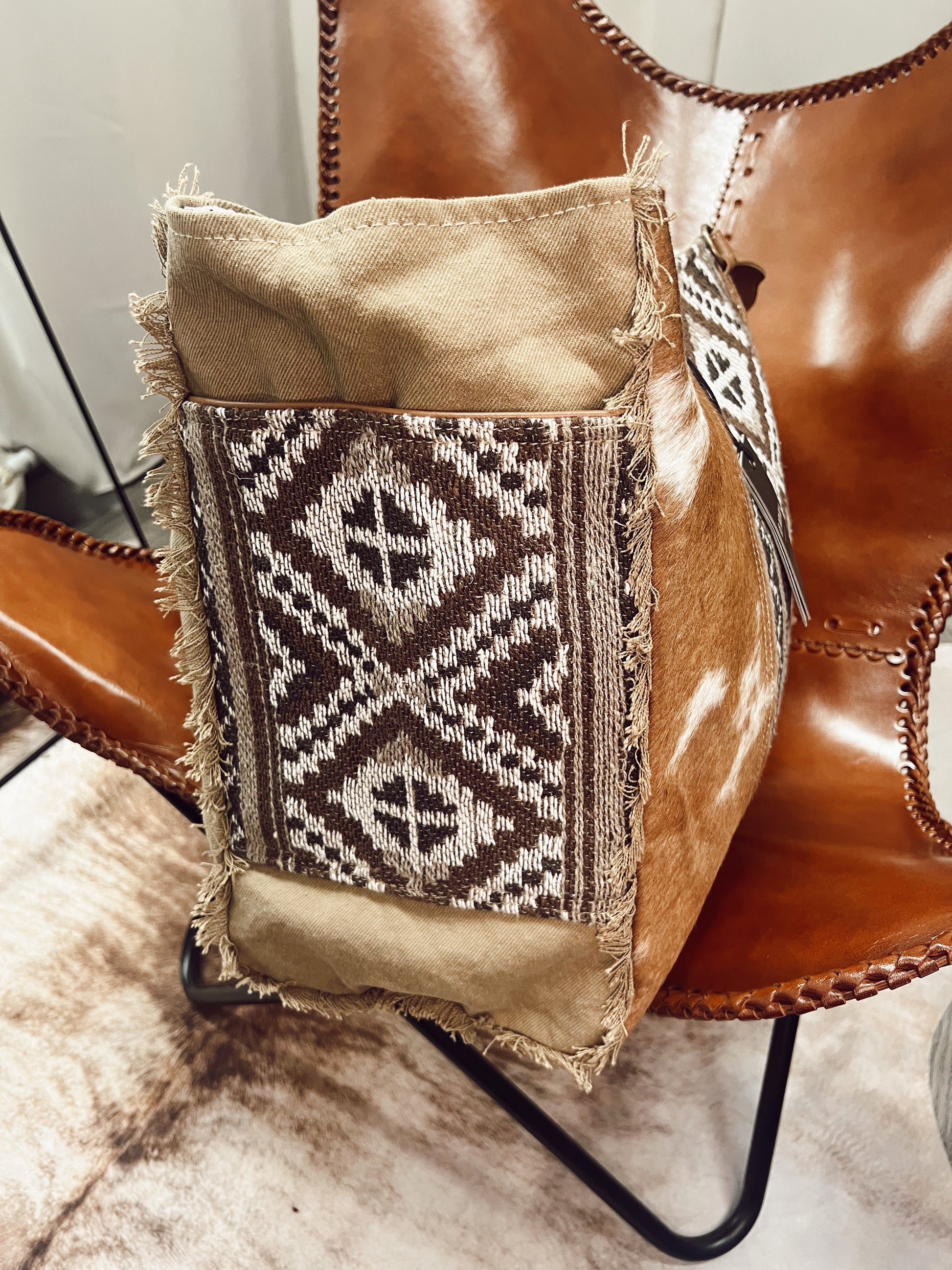 - The Weekender Bag is a stylish and unique bag perfect for weekend getaways. It is made with vintage fabrics and cowhide with leather accents, making each bag unique and one of a kind.