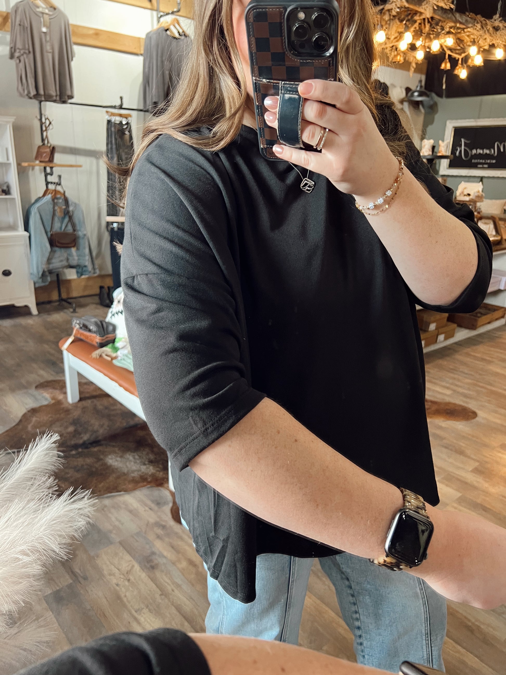 - Dropped shoulders with 3/4 length sleeves